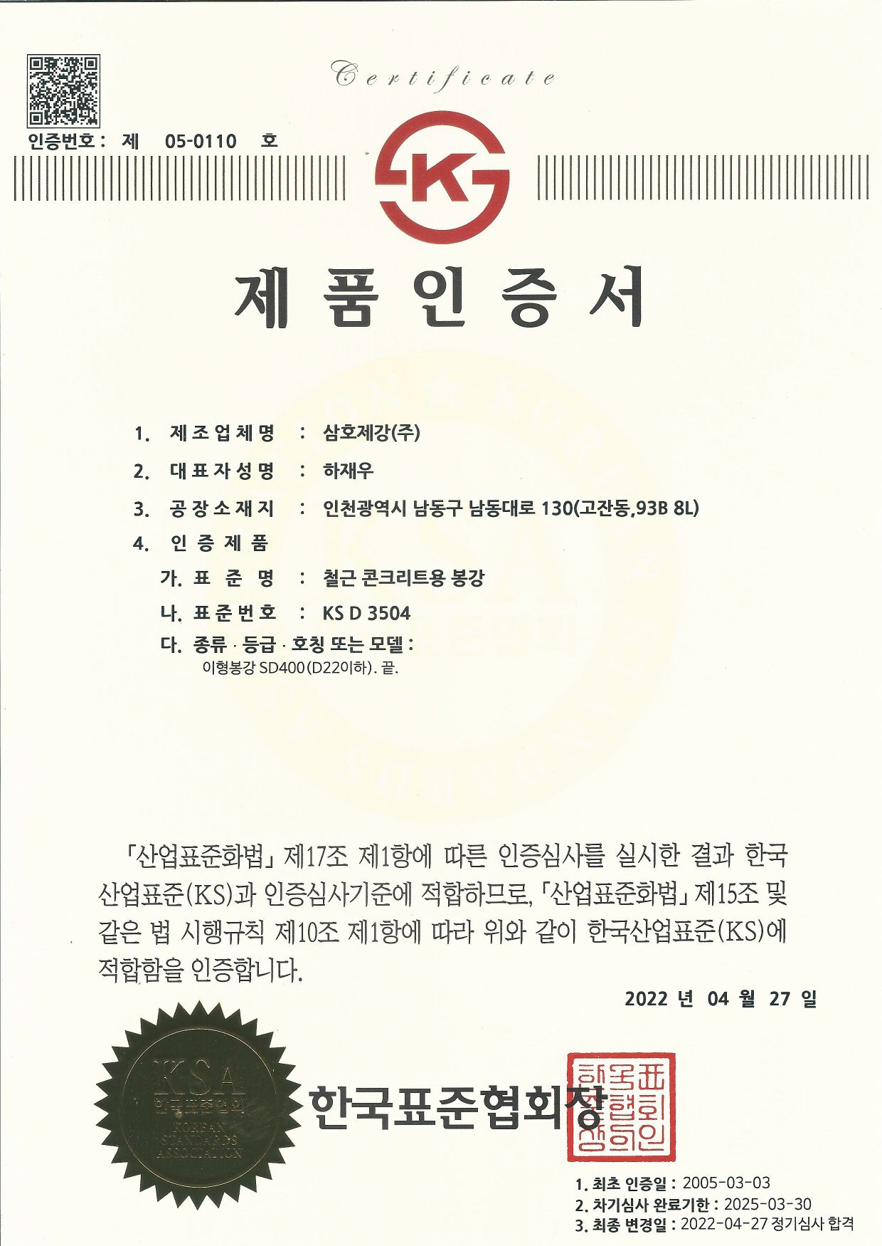 금강철강이 철과 함께한 역사는 공신력있는 품질인증에서 시작되었습니다.