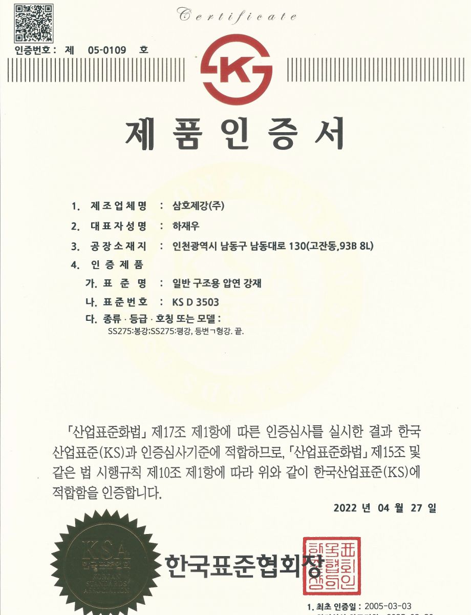 한국산업규격표시인증(KS) 취득 [일반구조용압연강재 KS D 3503]