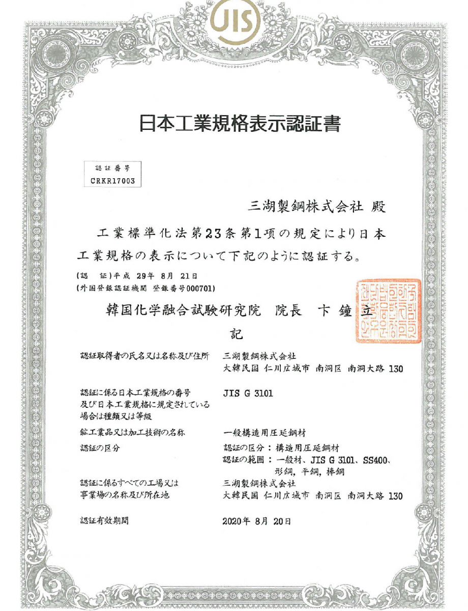 일본산업규격표시인증(JIS) 취득 [일반구조용 압연강재 JIS G 3101]